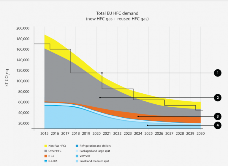 Les cibles de réduction progressive des HFC sont exprimées en équivalents CO2 [= PRP x kg] et ne concernent pas des réfrigérants spécifiques (la législation impose uniquement une interdiction dans des cas spécifiques, comme par exemple l’interdiction d’utilisation du R-404A dans les applications de réfrigération). Ceci donne au marché la flexibilité d’utiliser différents types de HFC et de mettre en œuvre différentes mesures : adoption d’un réfrigérant à PRP inférieur, réduction de la charge de réfrigérant, ou combinaison des deux.